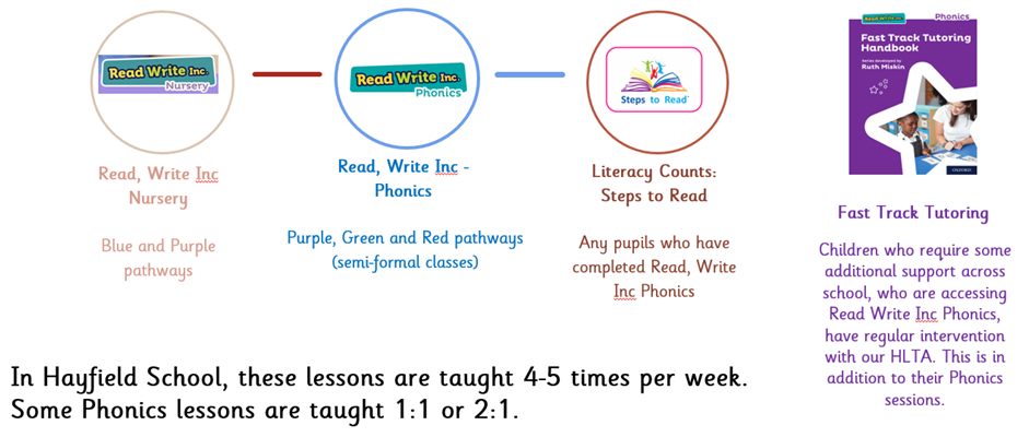 At Hayfield, pupils continue to receive personalised phonics teaching for as long as required, until they can confidently segment and blend words using all Set 1–3 complex speed sounds (explained further on the parent support phonics page). To ensure clear progression and to meet differing learning needs across the school, we use four adapted versions of the Read, Write Inc. programme.